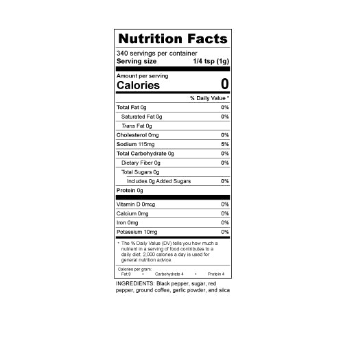black pepper, salt, Mexican brown sugar, cayenne pepper, ground coffee, garlic powder and silica (to prevent caking)